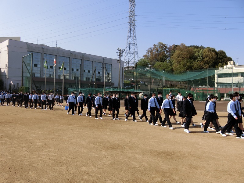 避難経路に沿って、避難場所の校庭に全校生徒が避難をします。