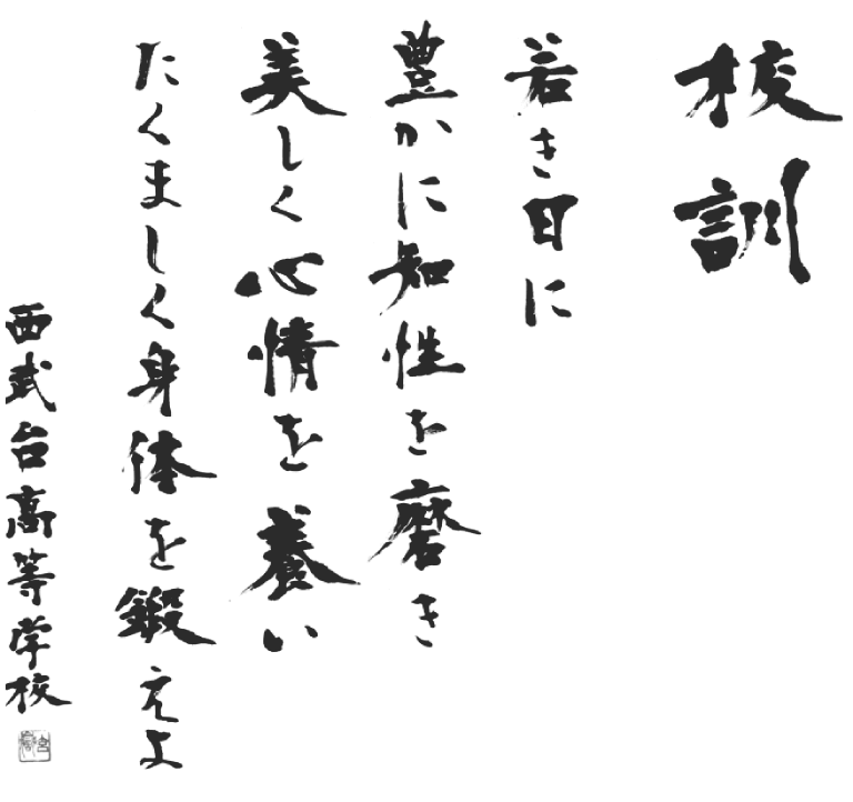 中央の三角部分は、森に囲まれ、泉湧き出る西武台の丘を表し、三角部分のふちどりは、県木「欅」の双葉を表し、全体のWの形は、ウェスト(西)の頭文字を表したものです。西武台の丘から雄飛する若人を象徴したのが本校の校章です。