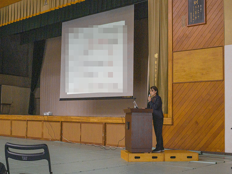 副校長挨拶の様子。本校の教育ビジョンや先日実施されたプログラミング教室の様子について説明がありました。