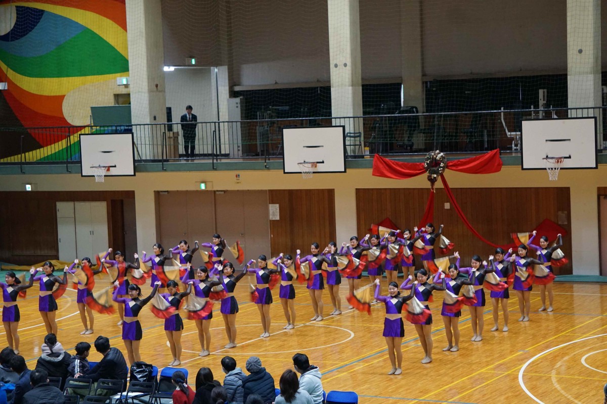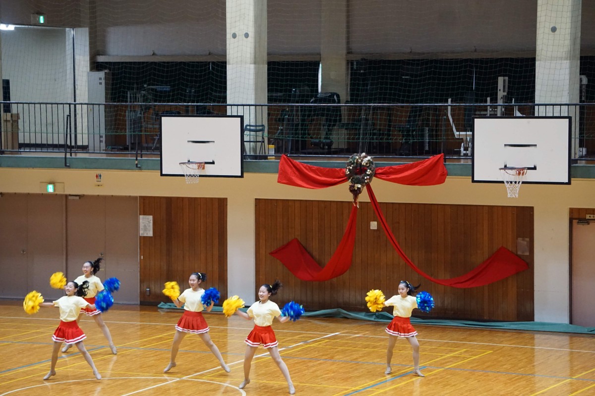 関東大会3位で全国大会へ出場が決まった中学生、全国大会常連で世界大会(アメリカ大会)でも優勝(ポン第1位、ショートフラッグ第4位)経験のある高校生の応援演技の披露がありました。