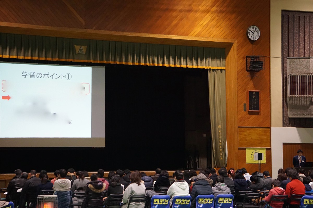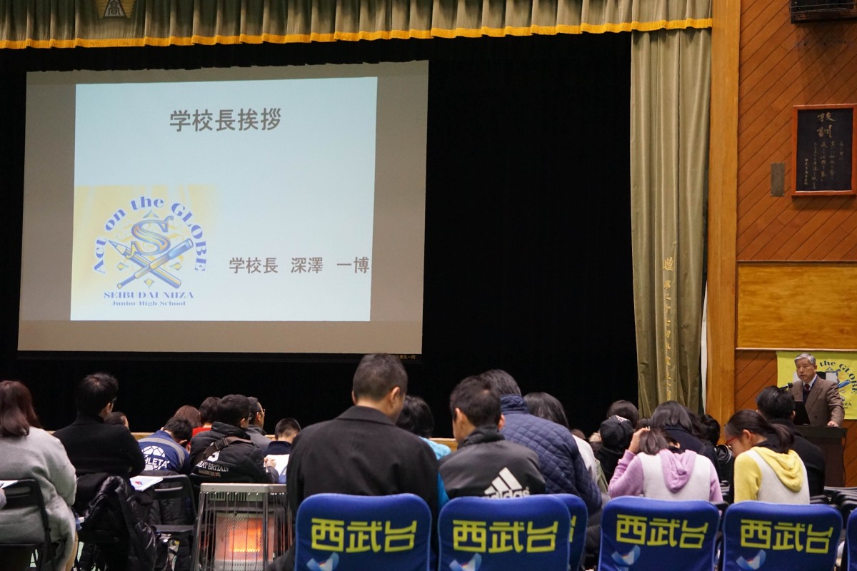 第1部では保護者・受験生の皆様に本校体育館にて学校長挨拶、本校の入学試験日程(中学入試)等の説明、国語・算数・理科・社会の担当から前回の入試問題傾向分析と今回の入学試験に向けての対策会を行いました。その他に西武台式英語や在校生からの応援メッセージ等の披露もありました。