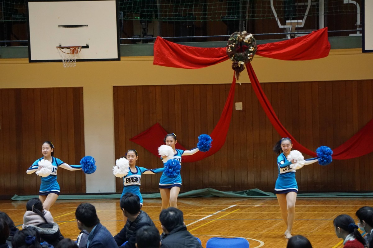 関東大会3位で全国大会へ出場が決まった中学生、全国大会常連で世界大会(アメリカ大会)でも優勝(ポン第1位、ショートフラッグ第4位)経験のある高校生の応援演技の披露がありました。