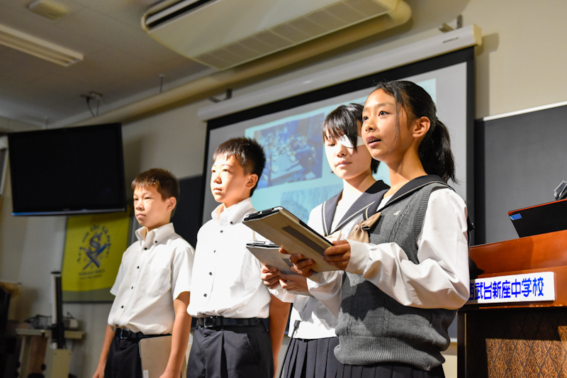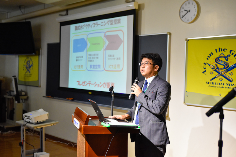 ICT教育主任・第1学年主任の河野からは、本校教育の特色でもある「西武台アクティブラーニング」についてお伝えしましたた。そのOUTPUTの部分であるプレゼンテーションを本校1学年の生徒に実践してくれました。