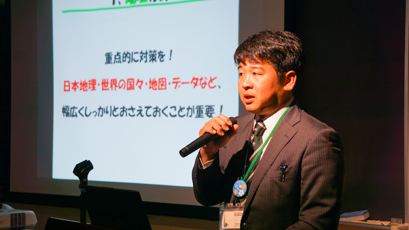 理科教諭堀内、社会科教諭真鍋による入試問題解説の様子。