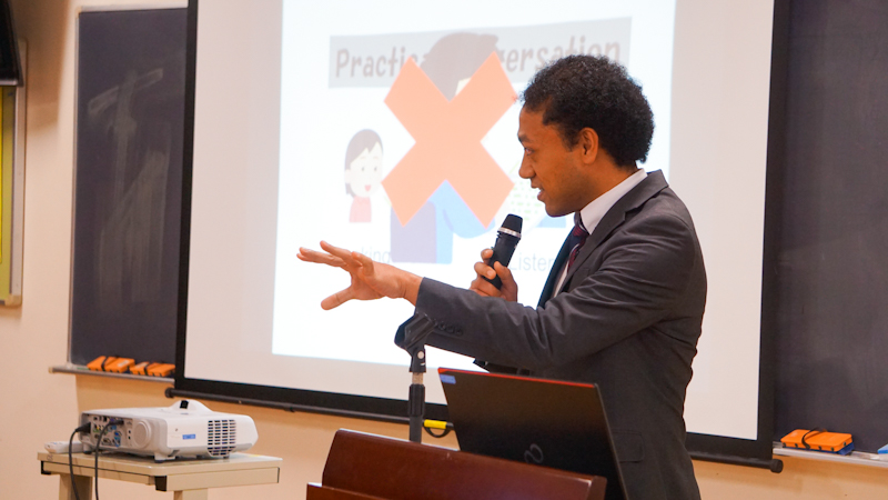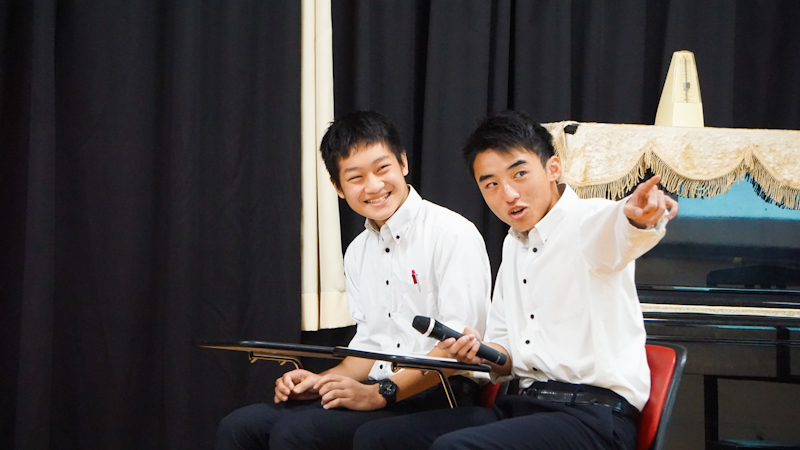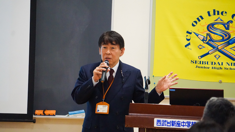 最後に、中学3年生2名とALTのモーゼス、英語科教諭仲丸による西武台式英語の実践をご覧いただきました、