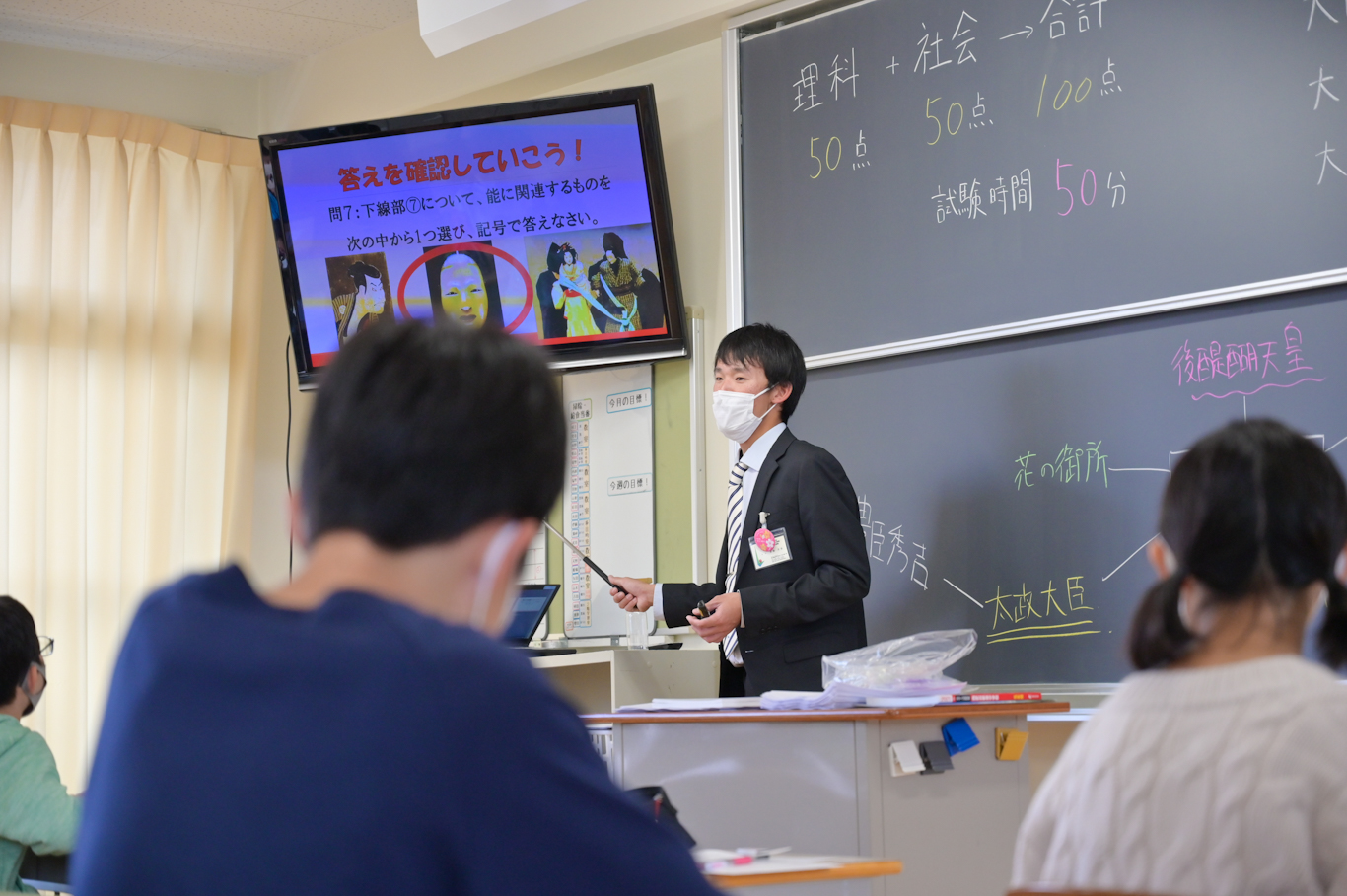 その後、本校理科科の中嶋・社会科の河野より、本校の入試問題の概要・対策についてご紹介致しました。