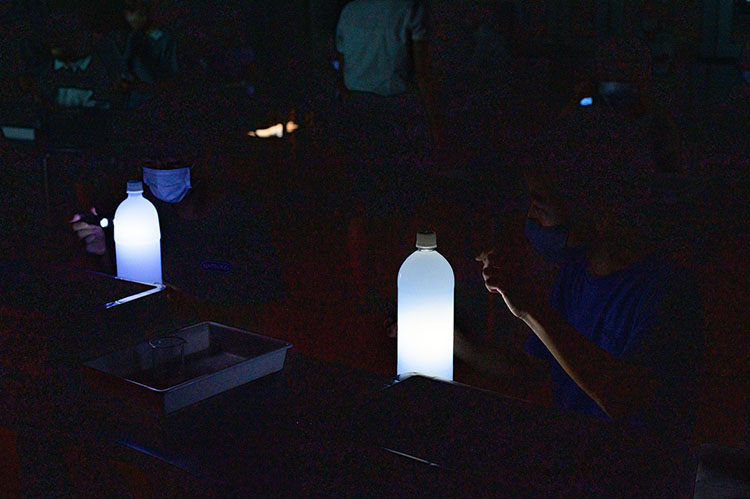 理科では、空の色の変化を虹の色や太陽の光などを参考にして仮説を設定し、ペットボトルを用いて実際に観察し、それを考察することを行なっていました。ペットボトル内で起こる光や色の見え方に驚いている様子が見えました。