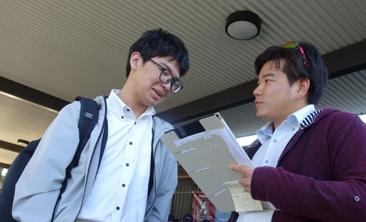 訪問期間が1日だけということもあり、セントドミニクス校では、本校の生徒たちのためにたくさんの企画が用意されていました。オーストラリアの伝統的な文化やスポーツを体験しようというテーマで、アボリジニ(オーストラリア先住民)の武器であるブーメランの装飾体験、オーストラリアンフットボール(通称オージーボール;ラグビーに似た球技)の体験をしました。本校の生徒たちは初めての経験に、ぎこちないながらも精一杯取り組んでいました。