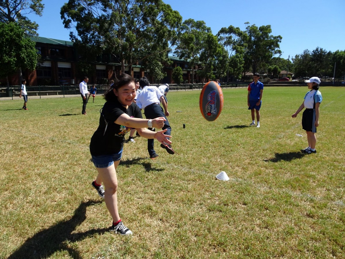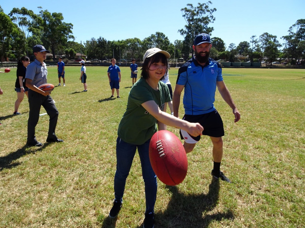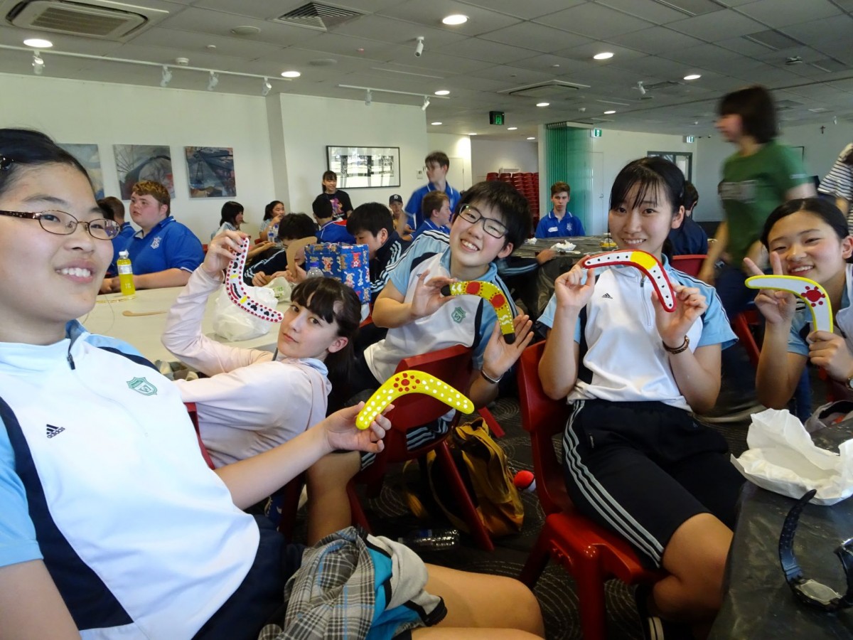 訪問期間が1日だけということもあり、セントドミニクス校では、本校の生徒たちのためにたくさんの企画が用意されていました。オーストラリアの伝統的な文化やスポーツを体験しようというテーマで、アボリジニ(オーストラリア先住民)の武器であるブーメランの装飾体験、オーストラリアンフットボール(通称オージーボール;ラグビーに似た球技)の体験をしました。本校の生徒たちは初めての経験に、ぎこちないながらも精一杯取り組んでいました。