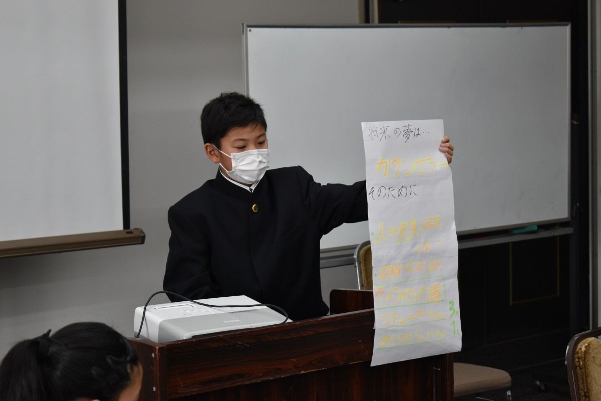 総合的な学習の時間では自らの将来の目標とそれに対してするべきことのまとめをし、全員の前で発表を行いました。1人1人が自分の未来と向き合い、これからしなくてはならないことを仲間同士で共有することができました。