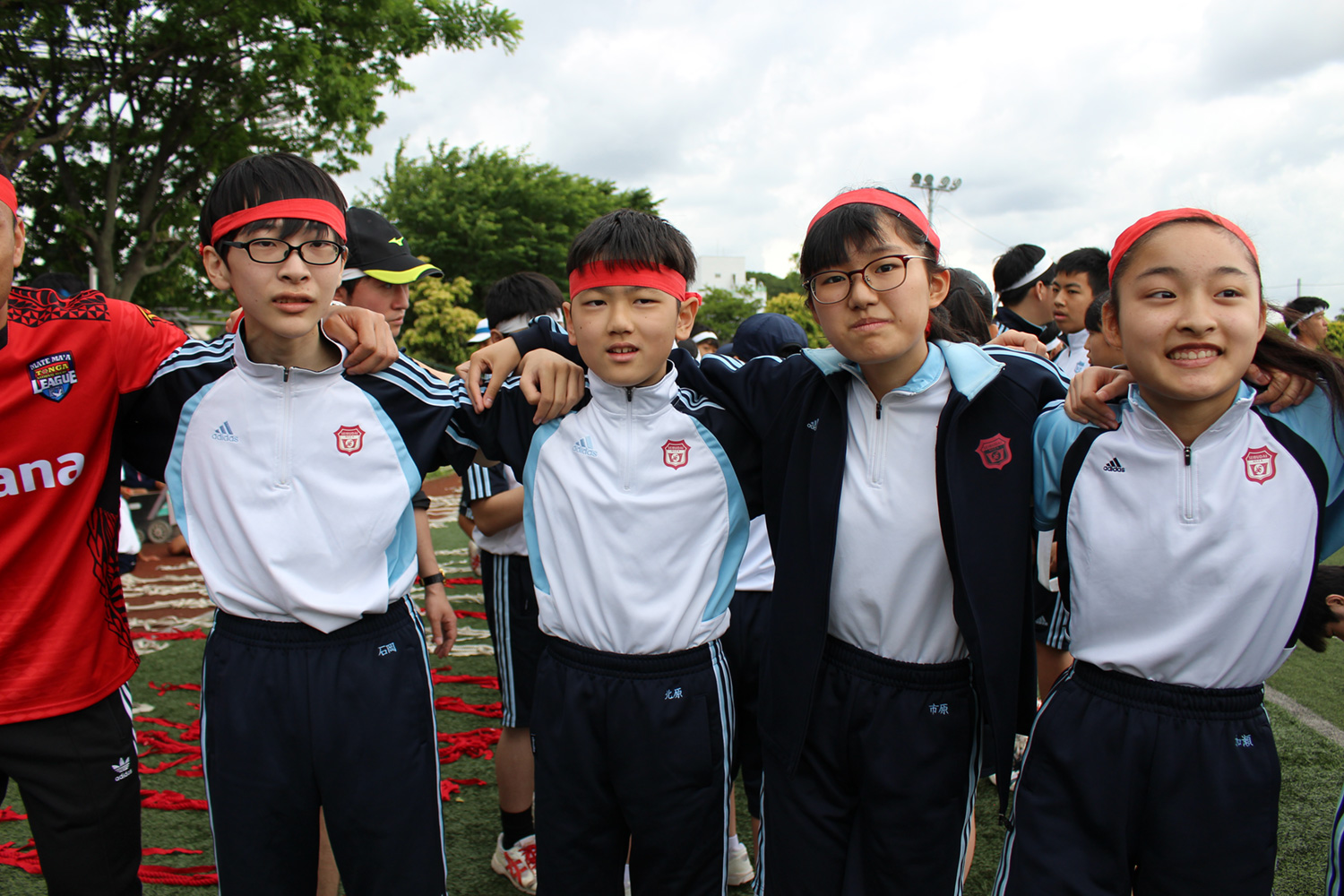 今年は中学1年生~3年生が4色(赤、白、青、黄)に分かれ、赤と白(桃団)の点数と、青と黄(緑団)の点数で競いました。