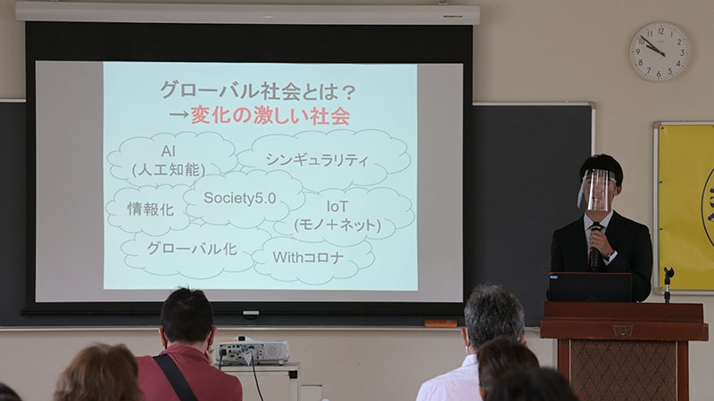 本校社会科の真鍋からは「グローバル社会で活躍する『たくましい人間力』」、そしてこの理念に基づいた「総合力活用教育」についてご説明させていただきました。
