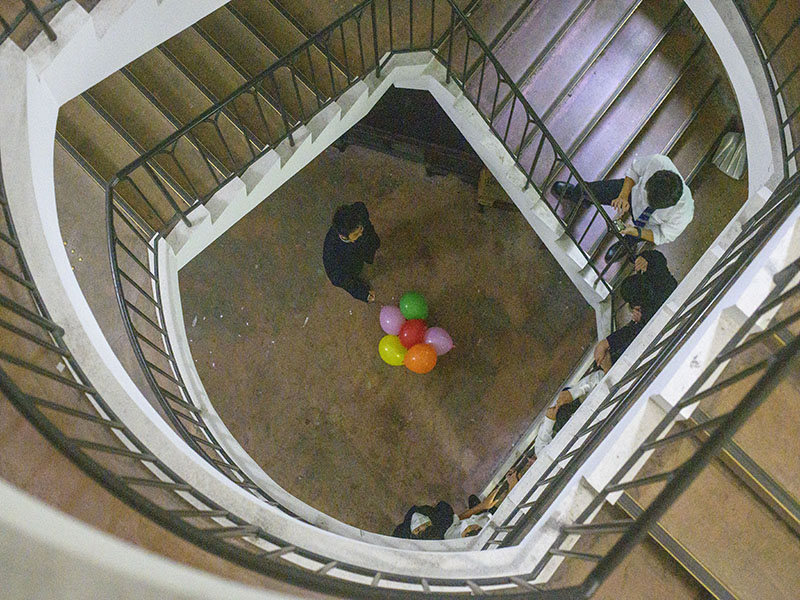 Science challengeでは、ストーリーのあるオリジナルアニメから、卵を割らないように地上約3階の建物から新聞と風船のみを利用して落としてみるという実験をしていました。卵が割れないようにどの班も創意工夫をしており、とても楽しんでいる様子が見えました。